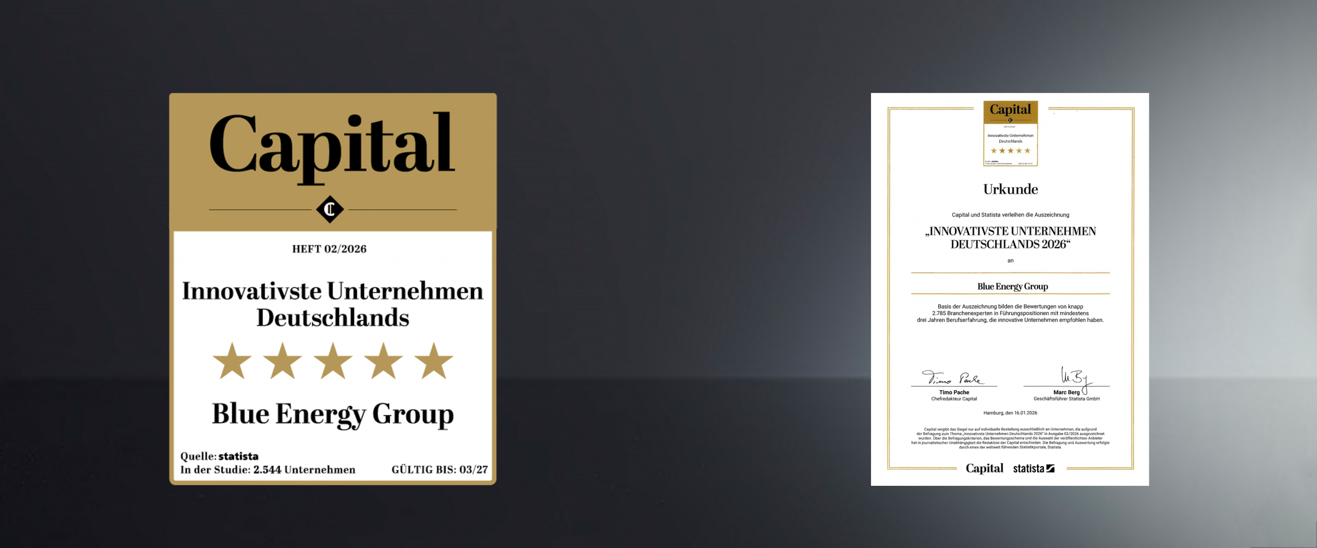 Wir als Blue Energy Group AG sind stolz darauf, 2026 als eines der innovativsten Unternehmen Deutschlands im Bereich Energie und Umwelt anerkannt worden zu sein. Diese Ehrung unterstreicht unser Engagement, kontinuierlich neue Entwicklungen voranzutreiben und mit modernen Technologien einen Beitrag zur nachhaltigen Energieversorgung zu leisten.